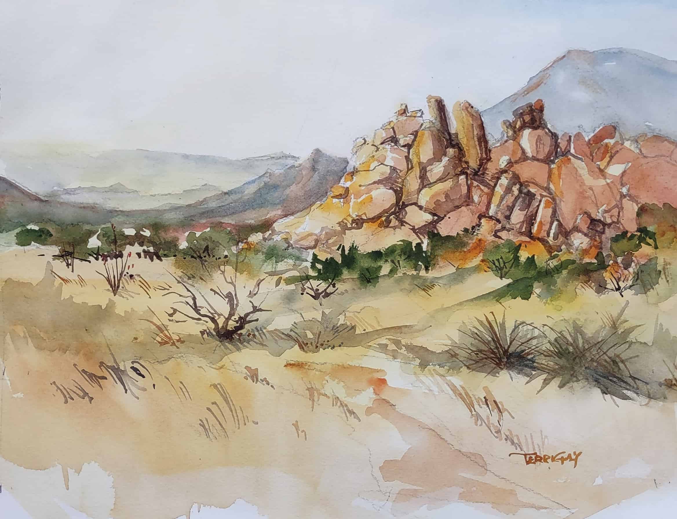 Terri Gay was inspired by her 815-mile trek along the Arizona Trail. During her six-year journey of hiking various sections of the Arizona Trail, Gay captured scenes in watercolor while battling wind, bugs, sun, and time limits. Most of the paintings were done in a single sitting, while others were done in a studio using field sketches.