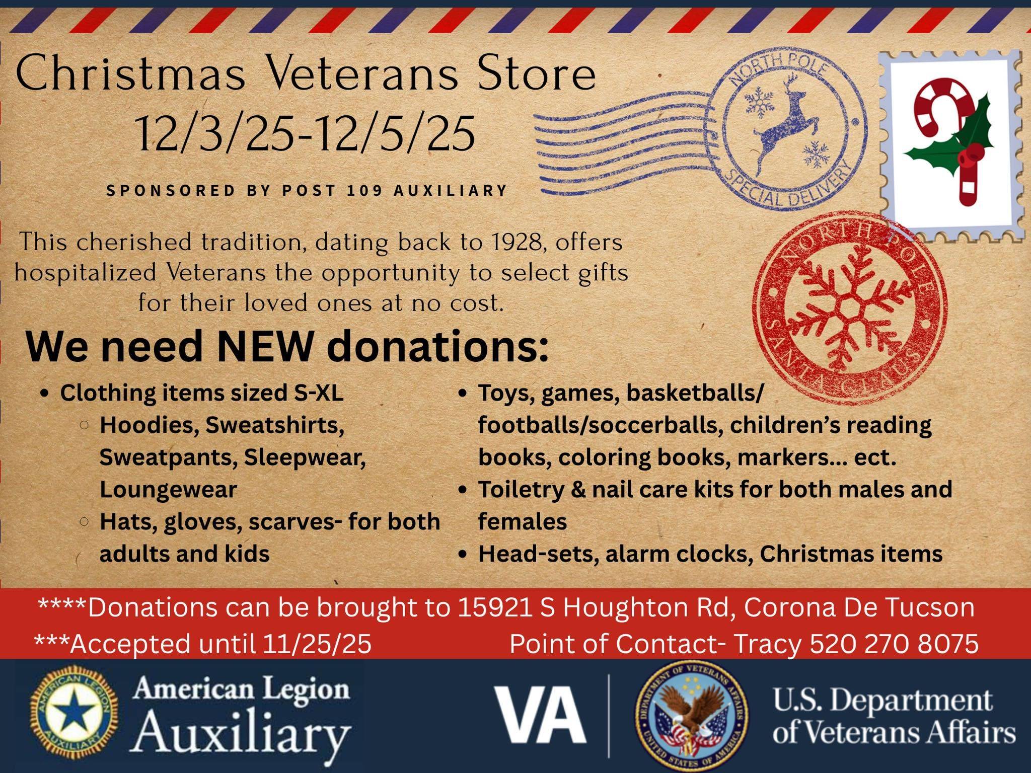 Veteran's Day is next Tuesday, and what better way to show your gratitude than by donating to the Christmas Veteran's Store? Gather NEW donations of clothing, toys, games, toiletries, Christmas items, and more. Then drop them off at the American Legion at 15921 S. Houghton Rd, Corona de Tucson, where our hospitalized Veterans can select gifts for their loved ones at no cost.