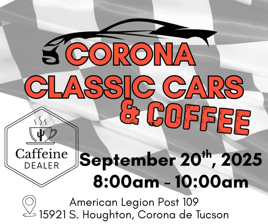 βCorona Classic Cars & Coffee | Bring your Trail Mix Passport and grab a drink from Caffeine Dealer while you enjoy the Classic Cars! | American Legion Post 109 - 15921 S Houghton, Corona de Tucson | 8 AM - 10 AM β