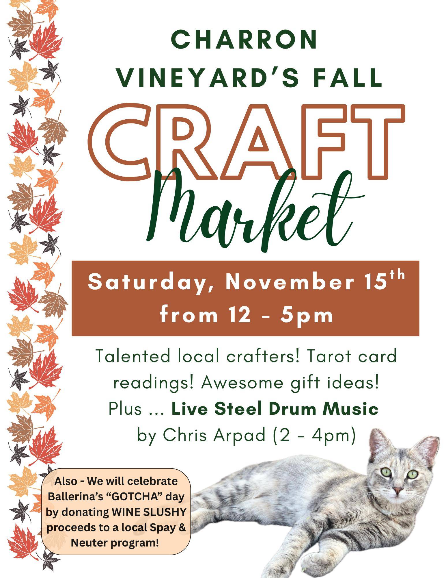 Kick off the holiday season with a craft market at Charron Vineyard this Saturday, November 15th, from 12pm to 5pm! Local crafters, Tarot card readings, gift ideas, and live steel drum music.