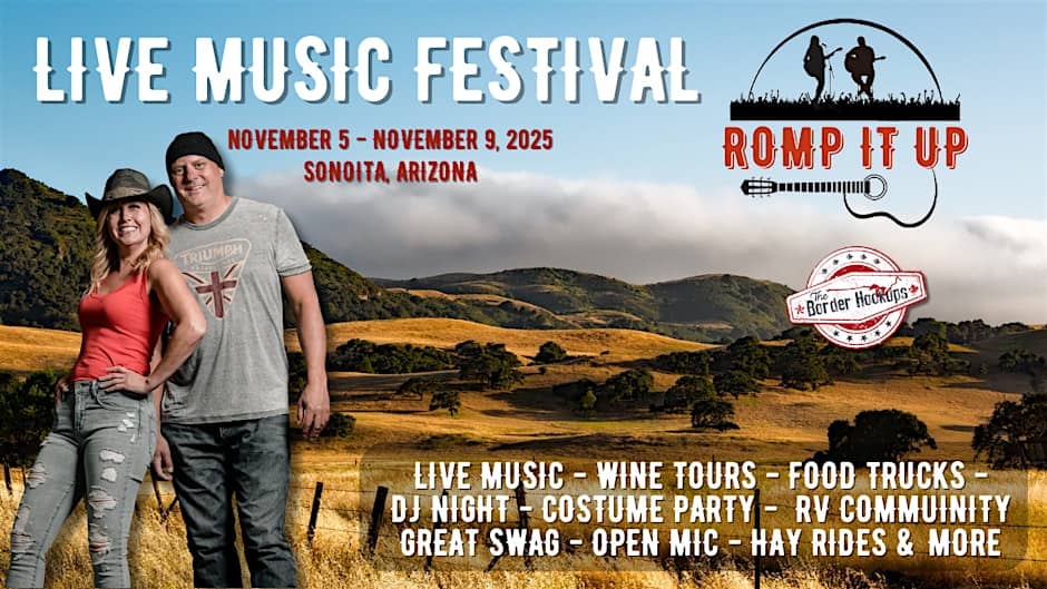 Headlining and organizing the festivities are the well-known entertainers, The Border Hookups. This power couple lives full-time in their RV. Every winter, they come to stay in Sonoita, Arizona, where they bring the fun with them at Romp It Up and play several other shows at local venues and wineries throughout their season here!